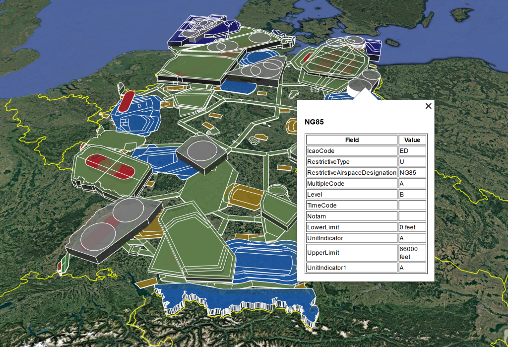 KEYVAN Aviation offering Special Airspace Dataset with worldwide coverage in KML format, enabling customer to easily visualize the data by using different GIS software or plugins. Keyhole Markup Language (KML) is an XML notation for expressing geographic annotation and visualization within two-dimensional maps and three-dimensional Earth browsers. The dataset included with 3D format with Worldwide coverage (195 Countries) and All Types of restrictions ( Prohibited (P), Danger (D) , Restricted (R) , Alert (A) , Caution (C) , Military (M) , Training (T) , Warning (W) , Control Airspaces.